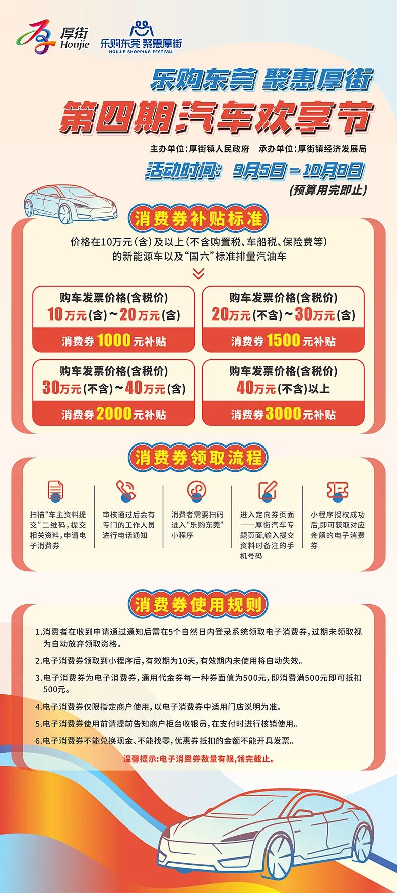 第二十五届东莞秋季国际车展将开启“十一”国庆长假购车狂欢模式,多家参展汽车品牌直投车展,带来展会专属购车优惠。此外,从9月5日起,乐购厚街推出了第四期汽车欢享节活动,向市民发放百万元购车补贴,个人最高可领3000元消费券,时间将持续至10月8日。