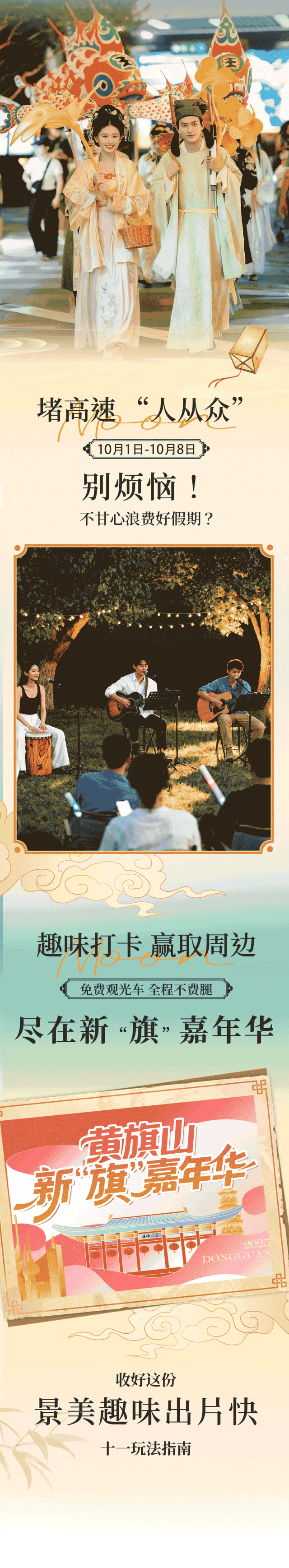国庆前三天,黄旗山城市公园正门广场,每天都有不一样的现场演出轮番上阵,开业期间还有免费观光车坐,实现“无痛”爬山赏美景~十一赶紧喊上家人朋友,来黄旗山—— 景美出片超有趣,轻松拿捏度假感!