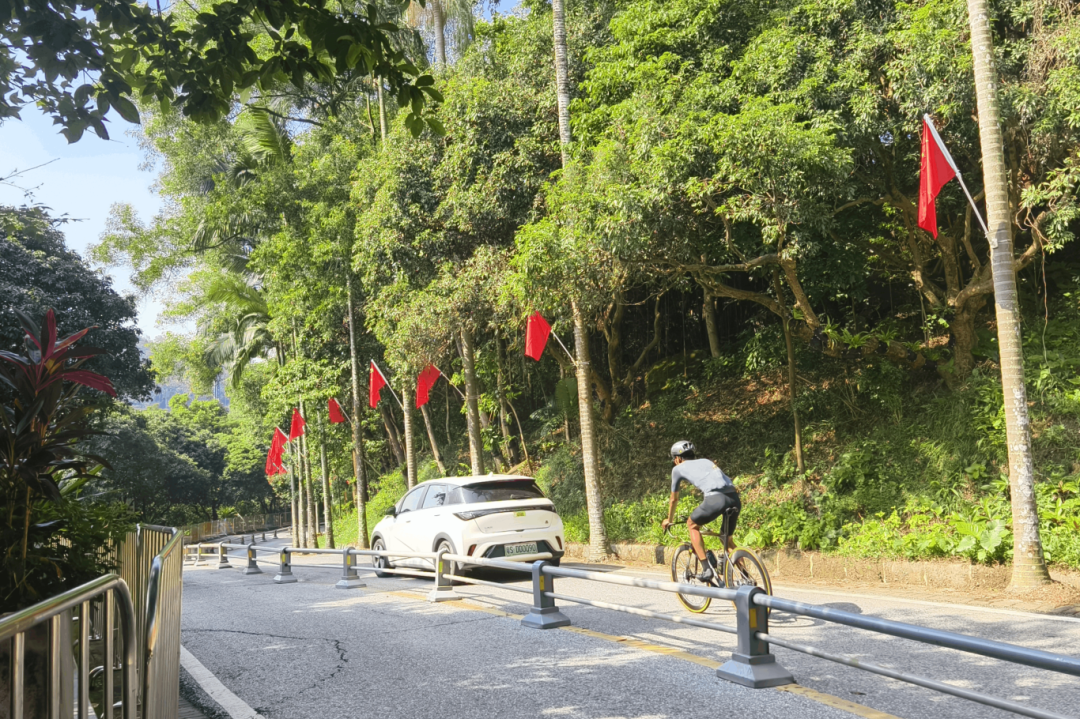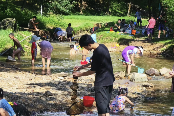 大岭山森林公园依旧是人气高地,园内溪流区域尤为热闹,清澈的溪水间,大人与孩子或赤脚涉水嬉戏,或专注地堆叠石塔。林间道路一侧,绿树成荫,鲜艳的红旗沿着道路次第飘扬,更添节日氛围。