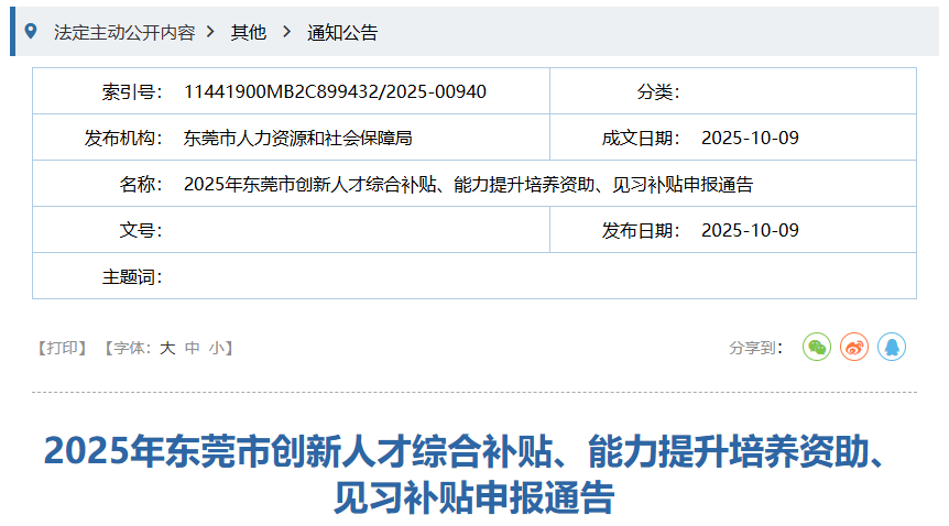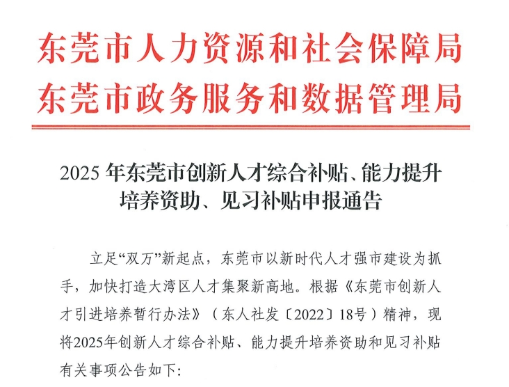 立足“双万”新起点,东莞市以新时代人才强市建设为抓手,加快打造大湾区人才集聚新高地。根据《东莞市创新人才引进培养暂行办法》(东人社发〔2022〕18号)精神,10月9日,东莞市人社局发布了《2025年东莞市创新人才综合补贴、能力提升培养资助、见习补贴申报公告》。