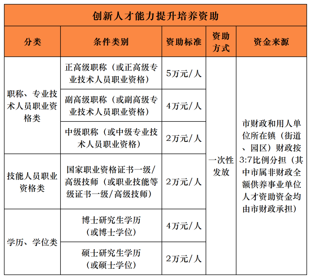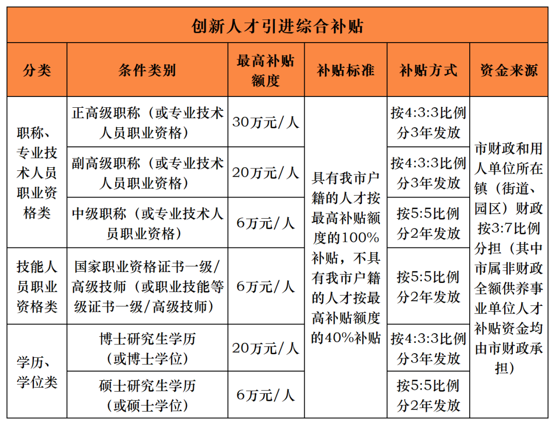 创新人才引进综合补贴