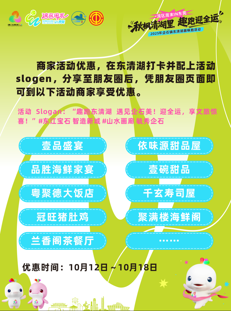 在东清湖打卡并配上活动slogen分享至朋友圈后,凭朋友圈页面即可到以下活动商家享受优惠。