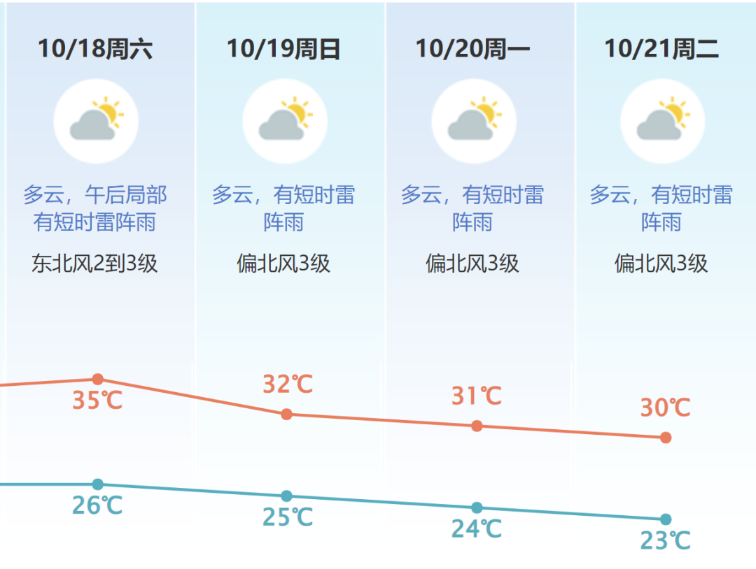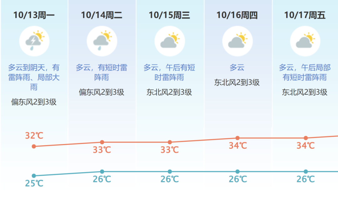 广东省气象台预计,10月13日—15日,粤西、珠江三角洲南部及西部、韶关、清远市县云量较多,有分散(雷)阵雨,雨时局部伴有短时强降水、8级左右雷雨大风等强对流天气,部分市县早晚有轻雾或雾;其余市县天晴炎热,最高气温33~35℃。