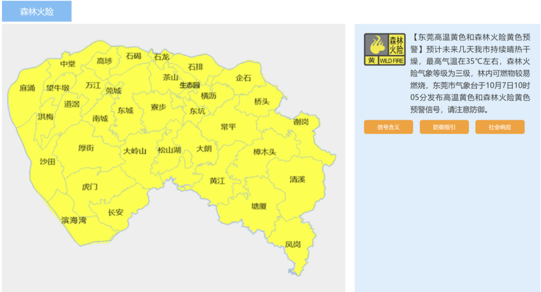 目前,东莞高温黄色预警和森林火险黄色预警生效中,虽有降雨仍要做好森林防灭火工作。