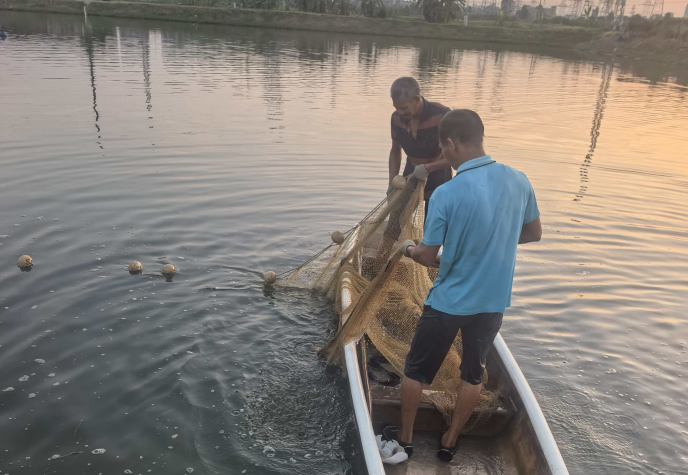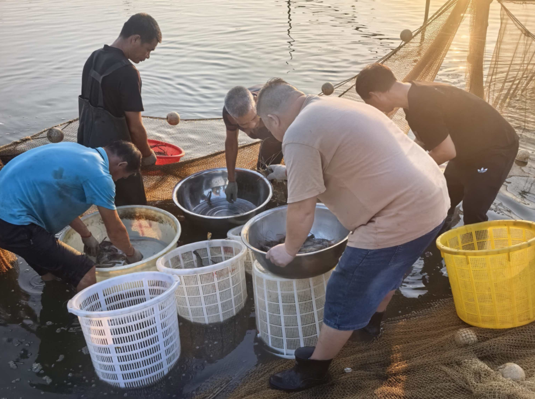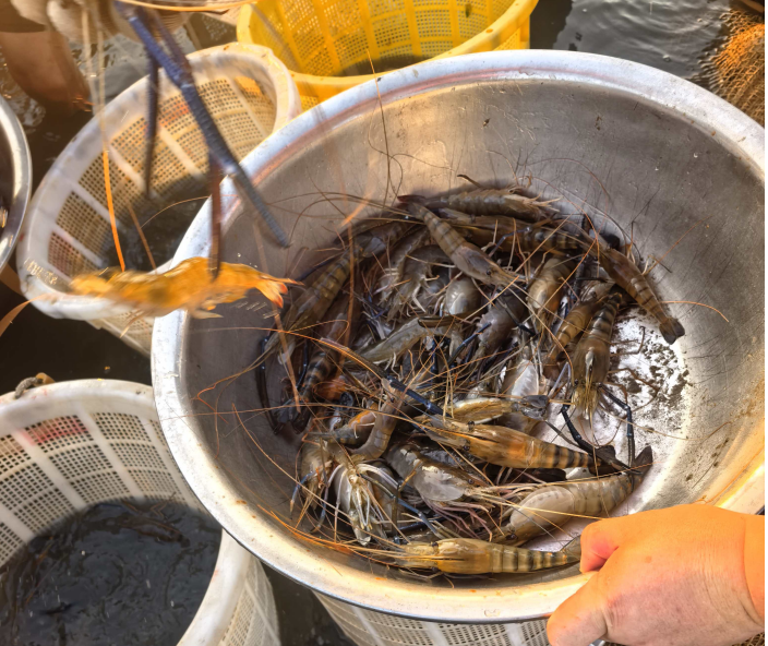 在养殖户张胜仔的水产养殖基地,岸边的箩筐整齐排列,刚从塘里捞起的南美白对虾、罗氏虾通体透亮,在筐里不停蹦跃,溅起的水珠沾在工人手上,却丝毫不影响大家的干劲——有人弯腰分拣大小虾,有人抬手将虾箱搬上货车,还有人笑着跟同伴算“今日收成账”。