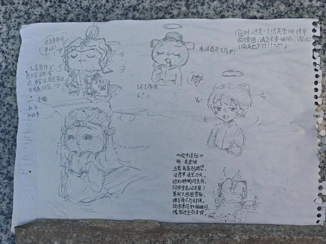 中秋节前,一张笔触稚嫩但情感真挚的漫画被留在位于东莞石碣镇的袁崇焕衣冠冢前,台风带来的雨水把纸张淋透,但“请您不要破坏”的字迹仍然清晰。