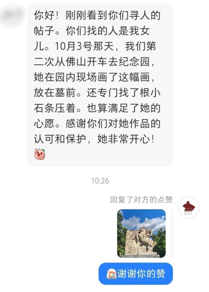 我们已小心翼翼将画作妥善收藏,它会成为纪念园里最珍贵的藏品之一。多想亲口对您说句感谢:谢谢您用画笔让这份敬意具象化,谢谢您在团圆佳节想起这位远去的英雄。