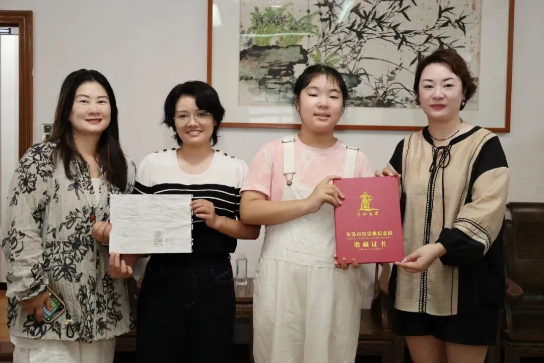经过几天的寻人,署名“浔啢”的画手出现了,这位12岁的女孩重访东莞,亲手接过了纪念园颁发的永久收藏证书。
