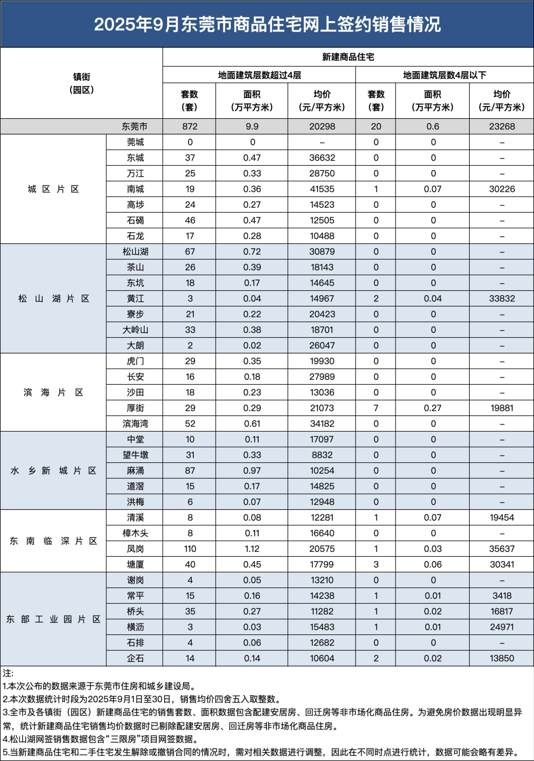 统计数据显示,2025年9月东莞新建商品住宅地面建筑层数超过4层的新房网签872套,较上月减少了137套,均价为20298元/㎡,相较8月份的21708元/㎡有所下降。