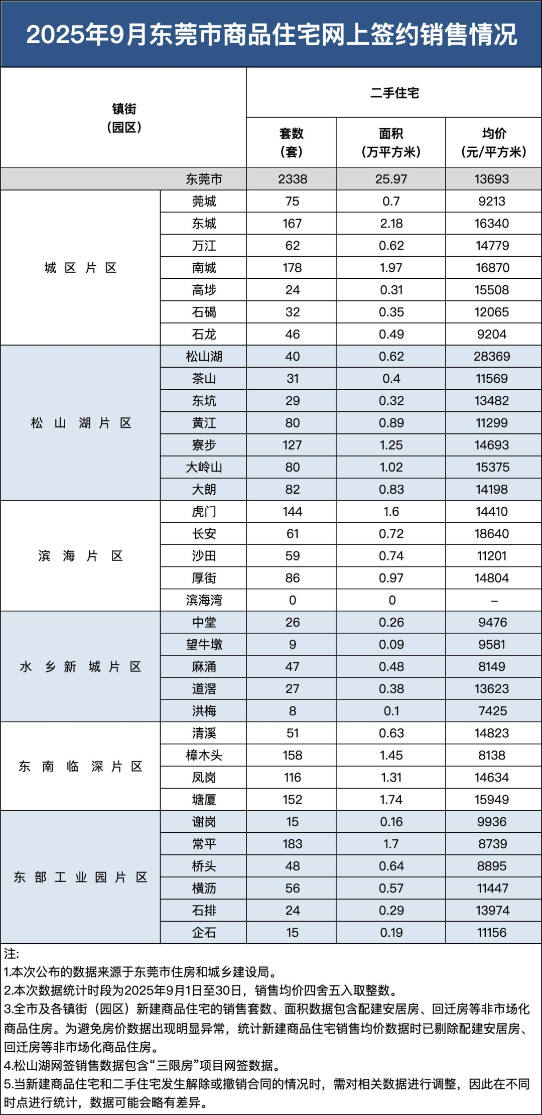 官方数据显示,2025年9月,东莞二手住宅网签套数为2338套,较上月减少了42套;网签均价为13693元/㎡,较上月的13757元/㎡有微降。