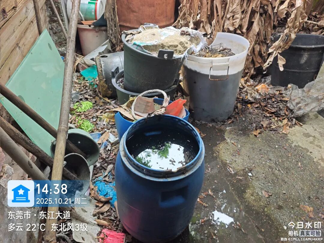 10月21日,万江街道在日常巡查中发现,汾溪路26号存在泡沫箱堆放的行为,这些泡沫箱在露天堆放中形成小型积水点,为虫媒生物提供了绝佳的孳生温床,构成了潜在的虫媒传染病传播风险。