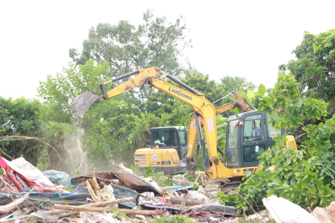 行动中,工作人员对每一处违规搭建进行了细致排查与登记,并耐心向居民解释清拆行动的必要性,协助居民将物品妥善搬运和安置。随后,挖掘机进场,对鱼塘周边所有牛间及搭建物、杂草杂树逐一拆除。后续,万江社区将对该区域进行全面的环境整治和清理,包括清运拆除后的建筑垃圾、清理残留的杂物和积水容器等,以彻底消除蚊虫孳生地。同时,统一提升环境品质,为居民打造一个整洁、美观、舒适的公共空间。