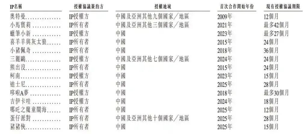 招股书显示,2022年-2024年全年,金添动漫来自前五大授权IP(奥特曼+小马宝莉+蜡笔小新+喜羊羊与灰太狼+小猪佩奇)的收入分别为5.36亿元、5.88亿元、7.54亿元,占总收入的90.0%、88.7%、85.9%;2025年上半年,前五大IP收入3.80亿元,占同期总收入的85.7%。