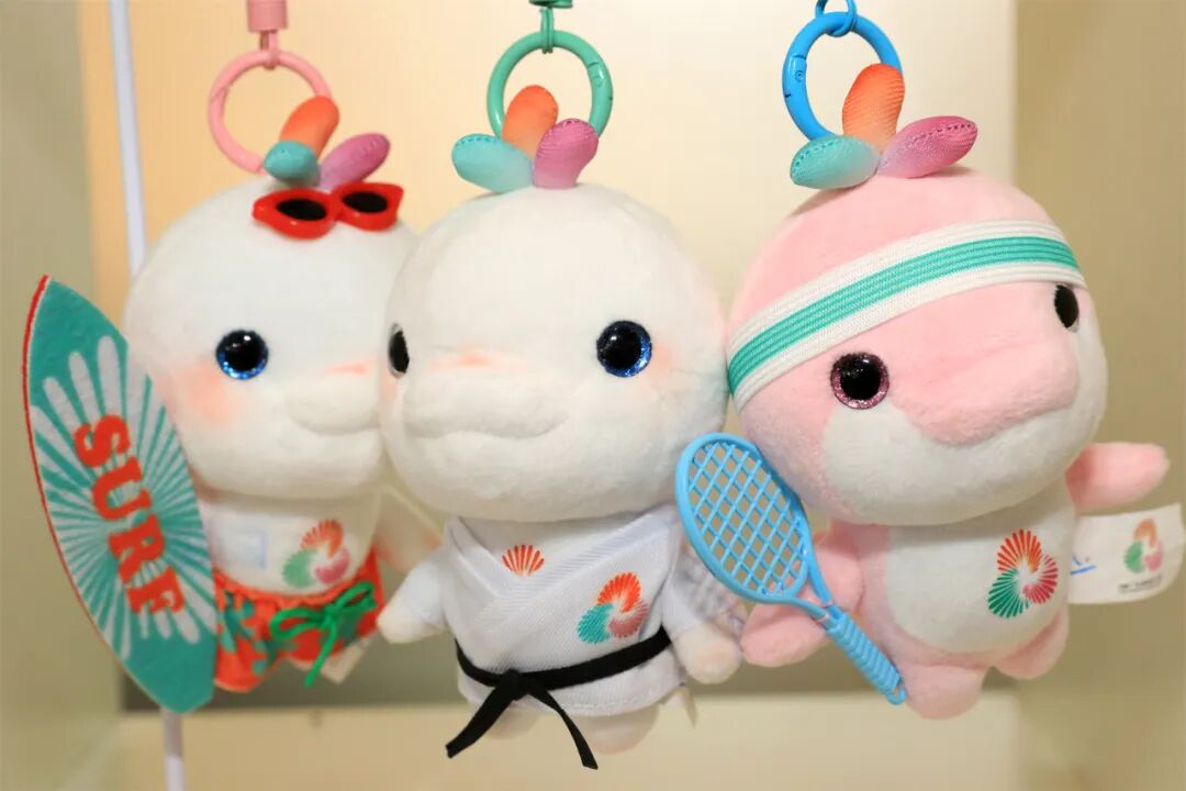 配合东莞承办的篮球与举重项目,推出相应运动造型款式,巧妙融入广州木棉花、香港紫荆花、澳门莲花等元素,推出头顶三色小水花可发光的功能款。