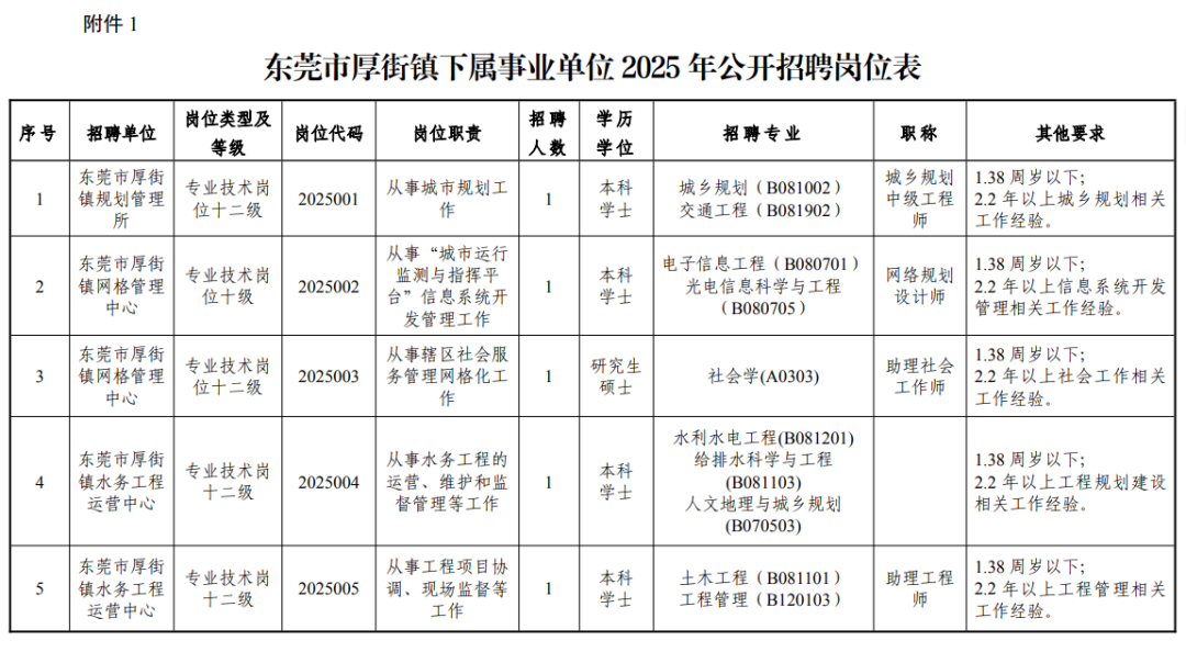 具体的招聘单位、岗位、人数和资格条件详见《东莞市厚街镇下属事业单位2025年公开招聘岗位表》(附件1)。