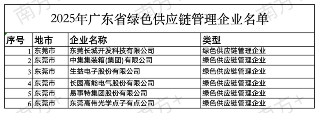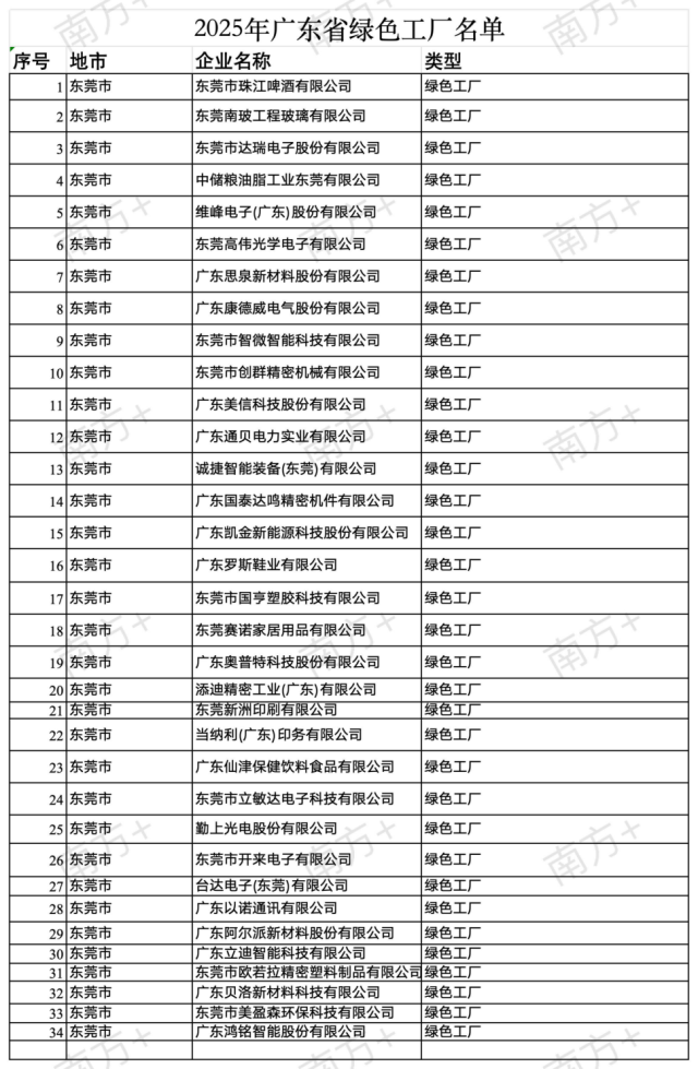近日,广东省工业和信息化厅公布《2025年度广东省绿色制造名单》。据名单,广东省(不含深圳市)今年共认定绿色工厂211家、绿色供应链管理企业30家、绿色工业园区1个。其中东莞认定为绿色工厂有34家,绿色供应链管理企业有6家。