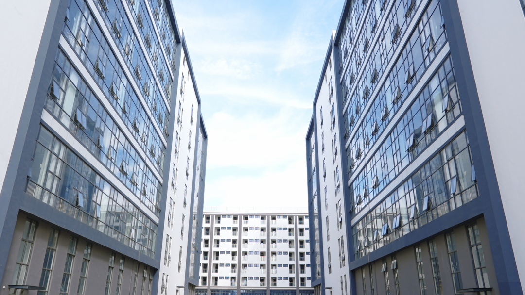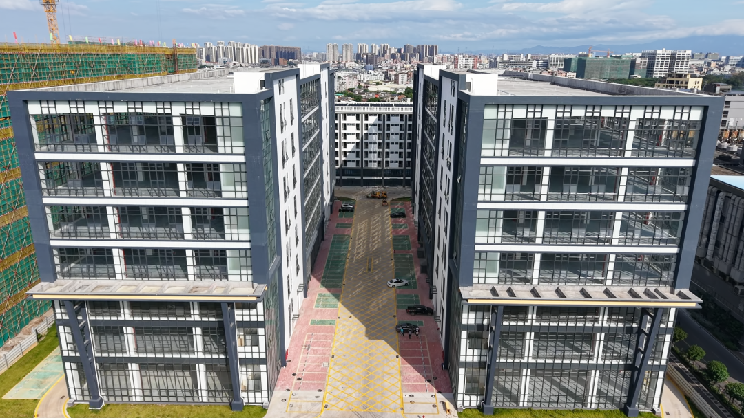 当前,随着工程节点的有序推进,产业园的实景风貌也逐渐清晰。园区建筑群已初具规模,灰白色调的外墙舒展大气,正立面的玻璃幕墙在引入自然光的同时更彰显出园区的科技感与时代特色。园区内,高标准厂房、宿舍、配电房等配套设施一应俱全,未来入驻企业可实现办公、研发、生产及员工生活的“一站式”解决。
