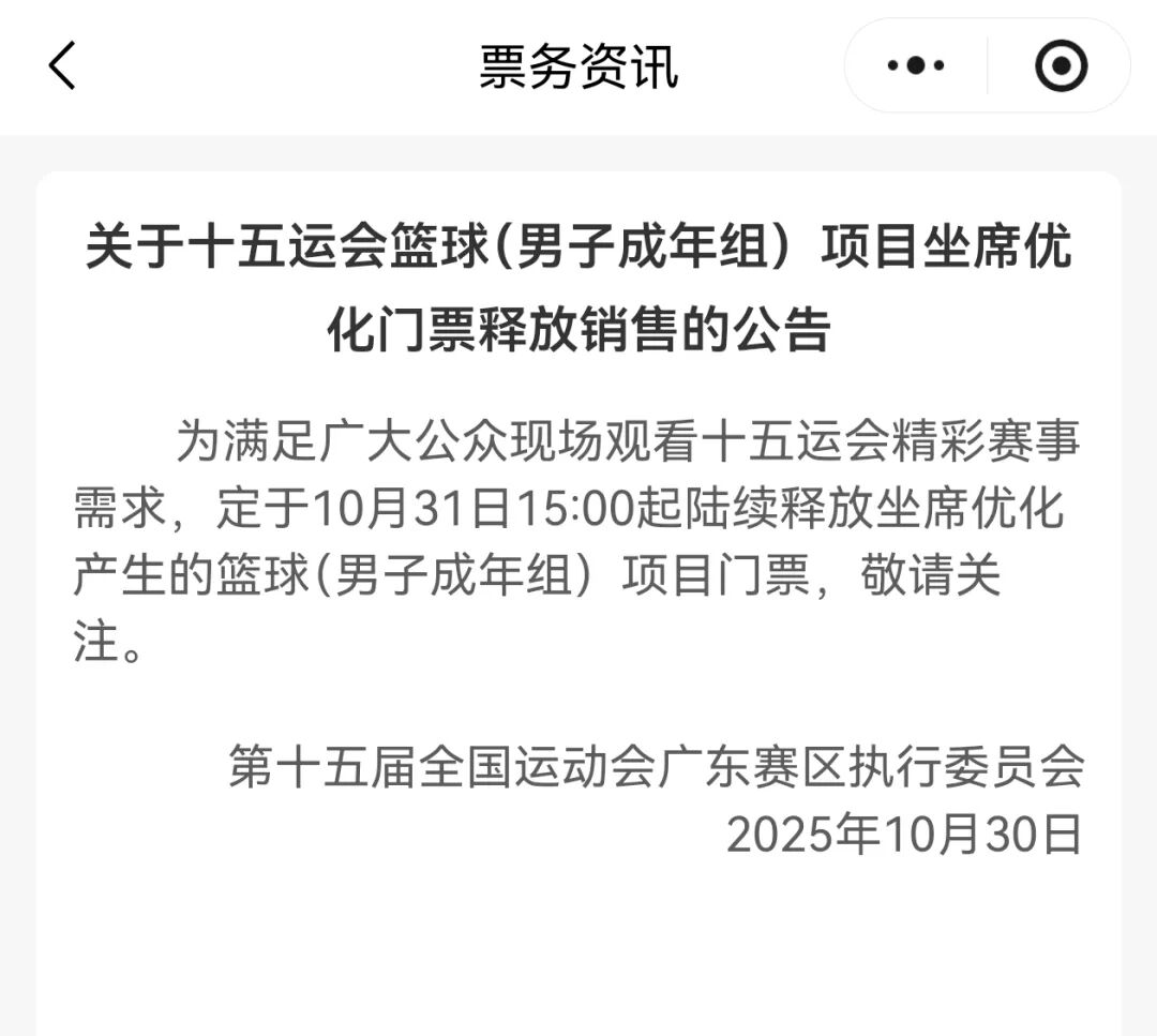 为满足广大公众现场观看十五运会精彩赛事需求,定于10月31日15:00起陆续释放坐席优化产生的篮球(男子成年组)项目门票,大家可前往各大官方销售渠道购票!