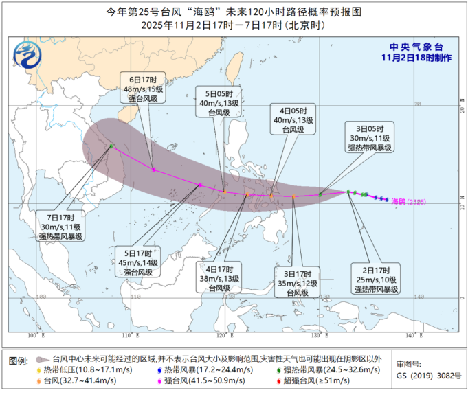 据中央气象台消息,今年第25号台风“海鸥”(热带风暴级)已于11月1日20时在菲律宾以东的西北太平洋洋面上生成,2日11时加强为强热带风暴级。“海鸥”对广东省陆地和近海无直接影响。