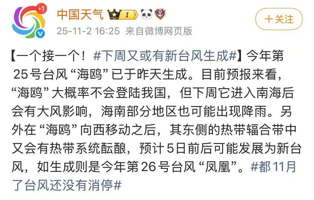 不过,本周可能又有新台风生成。据“中国天气”消息,在“海鸥”向西移动之后,其东侧的热带辐合带中又会有热带系统酝酿,预计11月5日前后,可能发展为新台风。如生成将会是今年第26号台风“凤凰”。