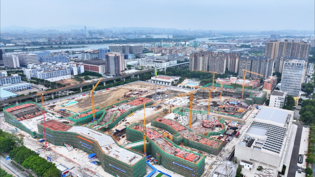 在项目建设现场,施工正在紧锣密鼓地进行。塔吊林立,机械轰鸣,近700名建设者奋战在施工一线。自今年6月全面开工建设以来,项目已完成大部分地下室和基础施工。除已封顶的1号楼教学楼外,5号楼艺术楼也即将完成封顶。