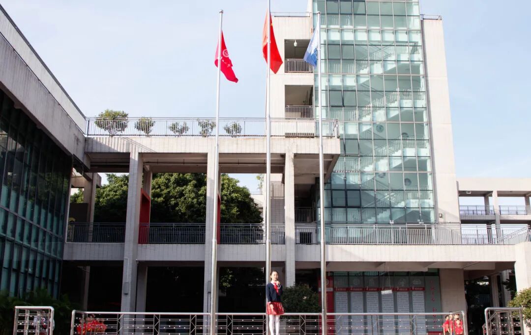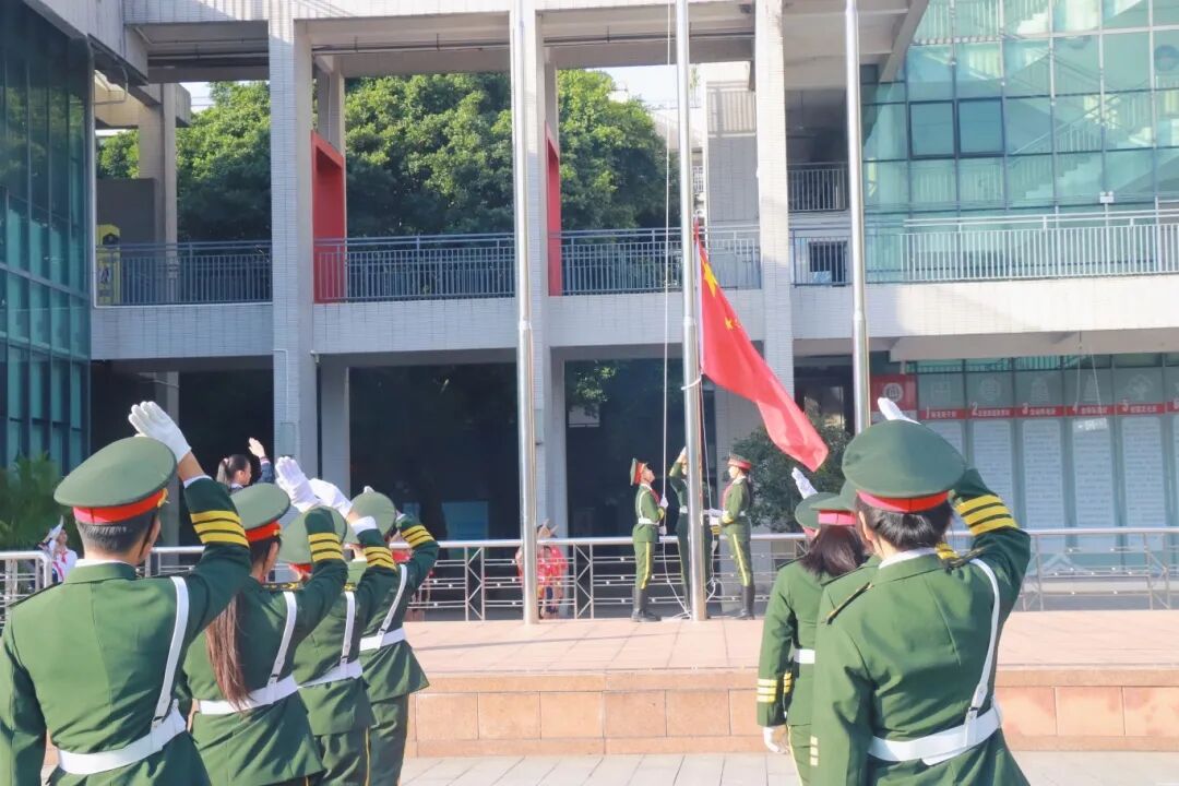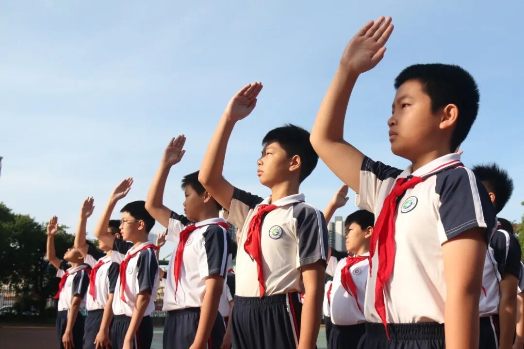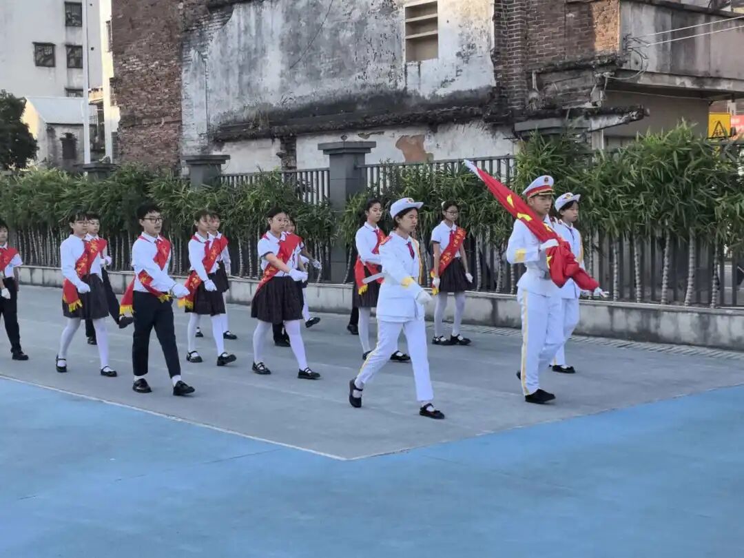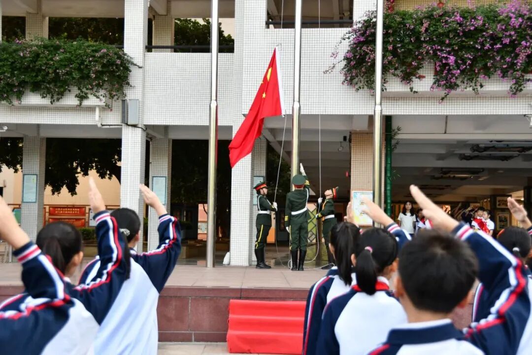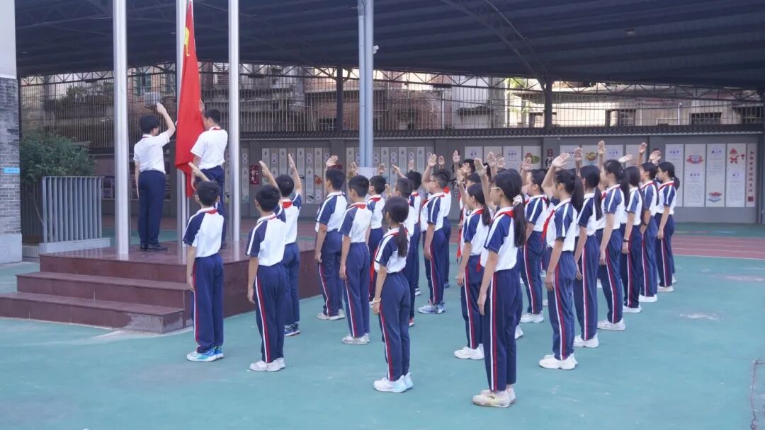 当天上午8时,莞城中心小学全体学生身着统一校服,整齐列队参加升旗仪式。在师生的注目礼下,英姿飒爽的国旗护卫队护送五星红旗进场。伴随着庄严的国歌,五星红旗冉冉升起,全场肃立行注目礼。