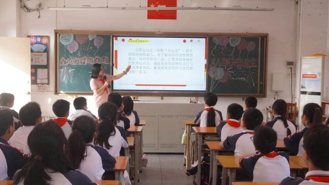 活动中,全体师生齐唱十五运会歌曲《气势如虹》;教师代表寄语师生将文明理念融入学习生活,共同为十五运会贡献校园力量。升旗仪式结束后,各班级开展主题班会,老师通过PPT、案例分析等方式讲解十五运会知识和文明礼仪,引导学生成为文明的传播者与践行者。