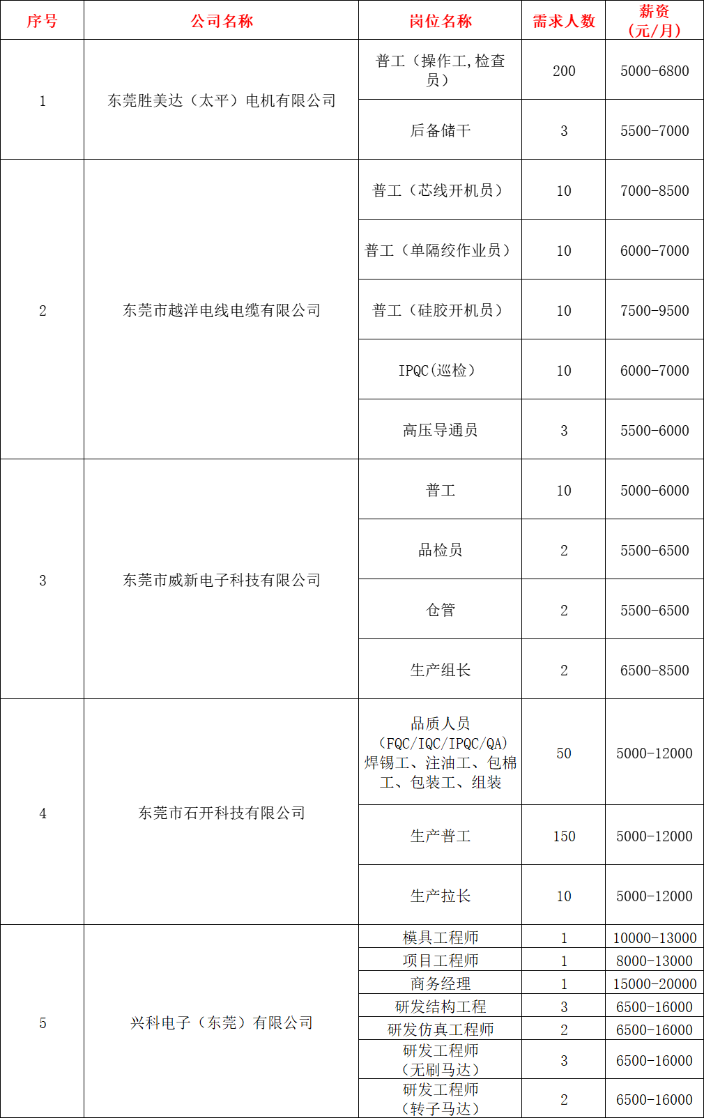 本次有东莞胜美达(太平)电机有限公司、东莞市越洋电线电缆有限公司等5家本土标杆企业参与直播招聘,覆盖电子科技等前沿领域,岗位选择丰富。综合月薪5000元起,核心岗位最高达1万元,有五险一金、带薪年假、技能培训等福利。
