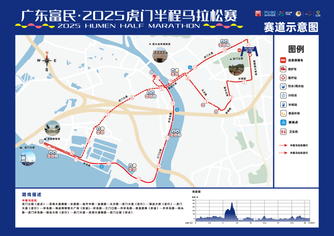本届赛事设有半程马拉松(21.0975公里)项目,起终点均设在虎门公园东门,途经多处城市地标与人文景观。