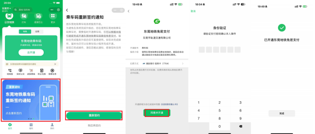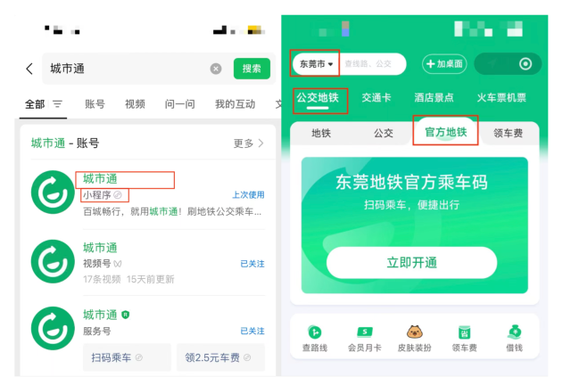 使用微信APP扫描以上城市通二维码或微信搜索“城市通”小程序,进入后将左上角定位切换至“东莞市”,点击“乘车码”,点击“公交地铁”,点击“官方地铁”,按页面提示开通新的地铁乘车码。