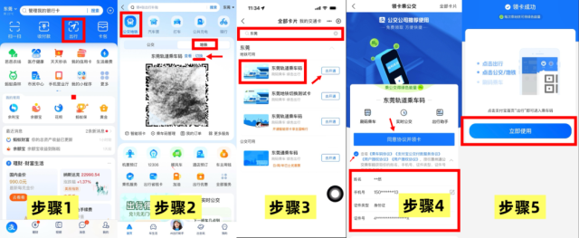 使用支付宝APP扫描以上支付宝二维码或打开支付宝,点击“出行”,点击“公交地铁”,点击“地铁”,点“切换”(二维码上),进入全部卡片页面,选择“东莞轨道乘车码”,点击“去开通”,勾选圆圈,确认信息无误,点击“同意协议并领卡”,点击“立即使用”。