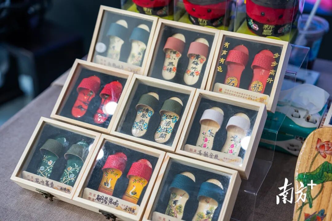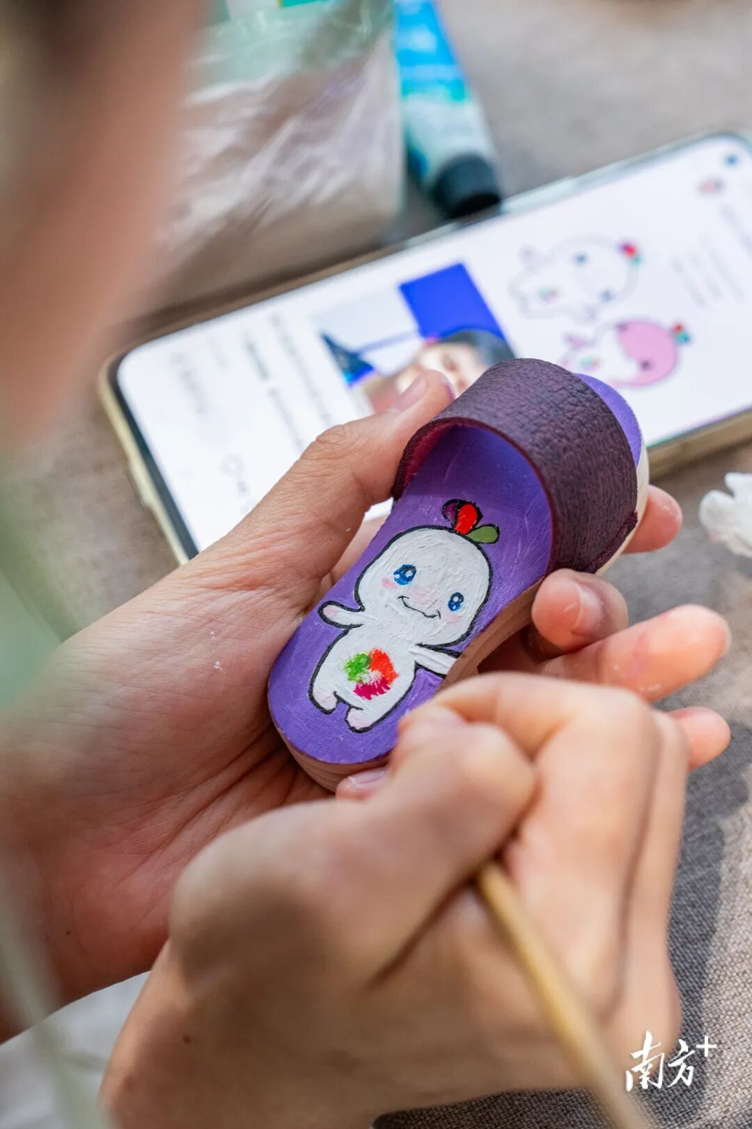 现场,非遗代表性传承人梁锦泉、梁家聪父子指导大家在一只只迷你木屐上创作。据了解,红漆描花传统木屐制作技艺是东莞市级非遗代表性项目,工序繁复,尤以“描花”一步最为关键,赋予木屐独特美感。