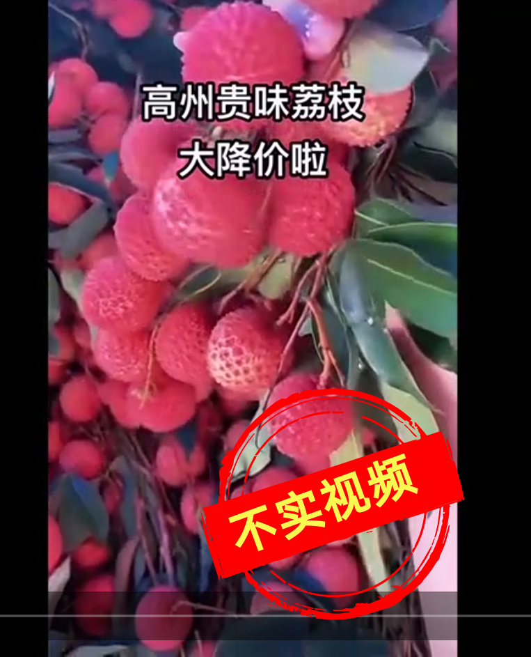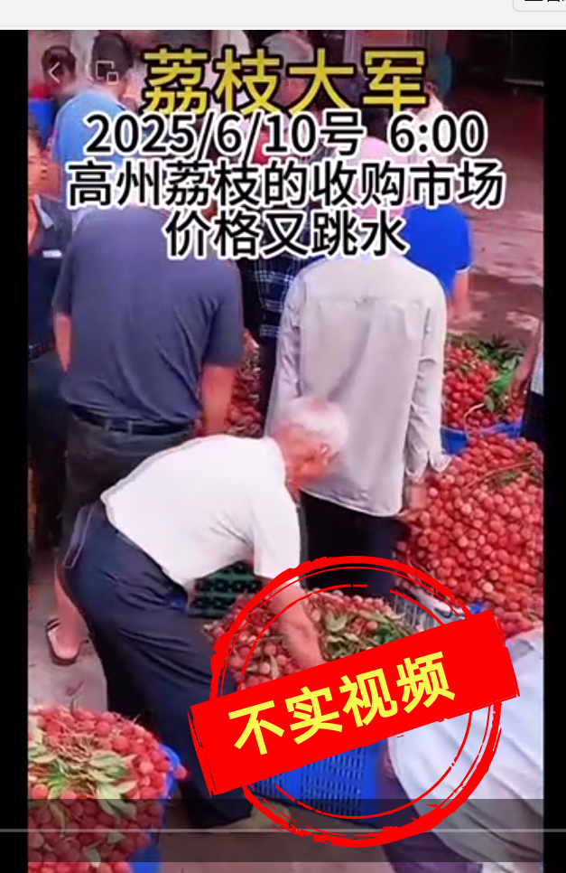 “我们发现部分视频博主在荔枝收购点刻意选择品相差的荔枝拍摄,配上夸张的标题和凄婉的背景音乐,制造‘价格暴跌’的假象。实际上,优质桂味荔枝在主产区的收购价一直保持稳定,电商平台上的销售价普遍在十多元至三十多元之间。”