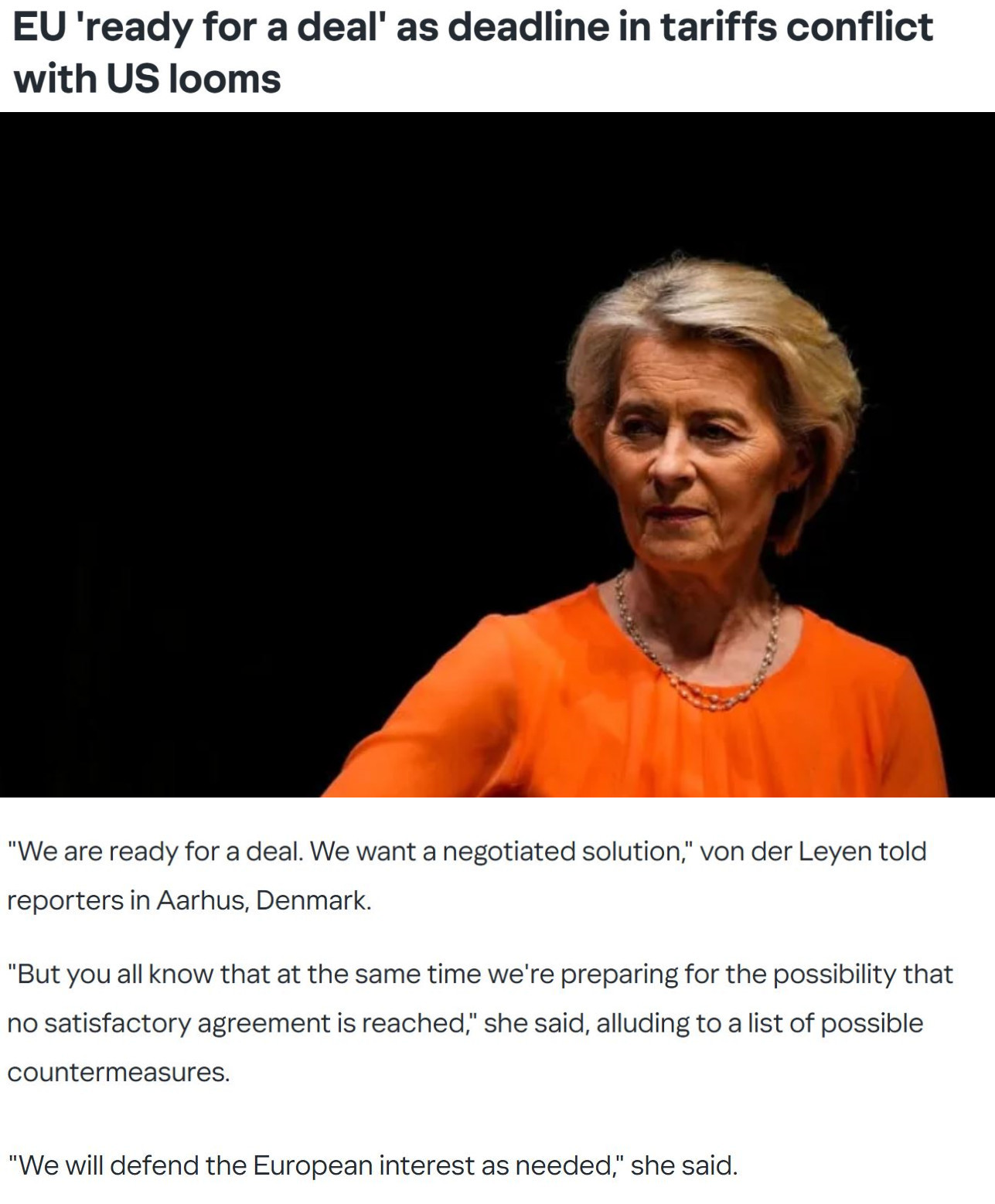彭博社报道说,欧盟和美国都希望在7月9日之前达成一项临时协议,以允许谈判在最后期限之后继续进行,但欧盟也在准备应对对策。