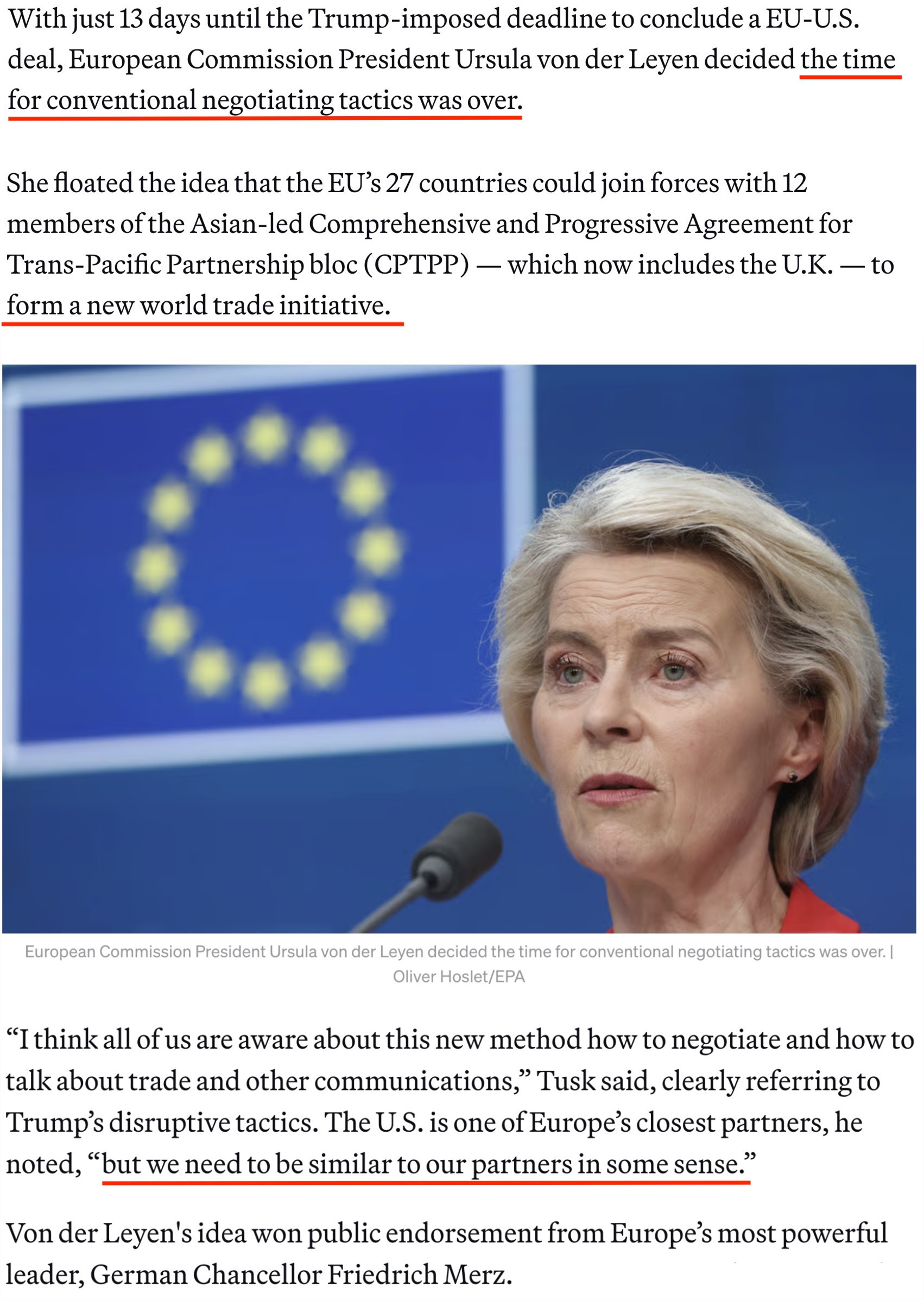 在欧盟委员会主席冯德莱恩看来,遵循传统谈判策略的时代已经结束。为此,她提出一个构想:欧盟27个成员国可以与亚洲主导的CPTPP的12个成员国联合起来,成立一个新的全球贸易倡议。