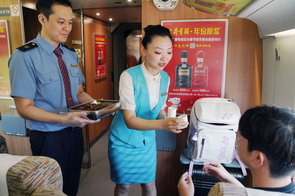 7月1日,长三角铁路上的餐饮服务员为旅客介绍新品餐食。新华社记者 王翔 摄