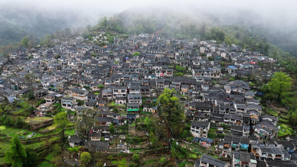 2025年3月30日,在广东省清远市连南瑶族自治县三排镇南岗村拍摄的云雾中的千年瑶寨。