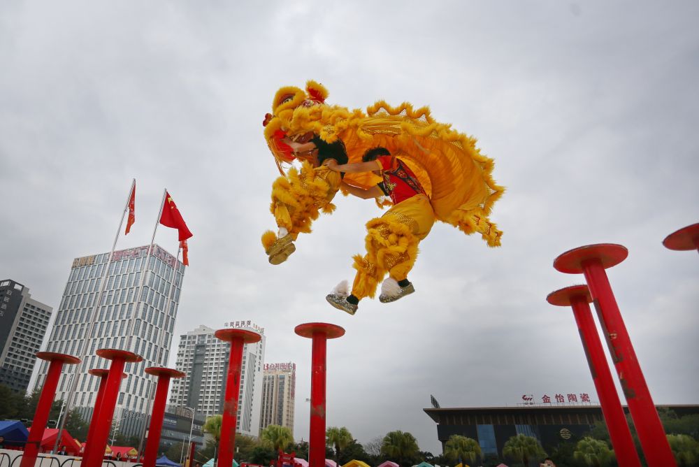 2025年1月22日,鹤山禧诚龙狮队在广东省佛山市禅城区南庄镇进行梅花桩舞狮表演。