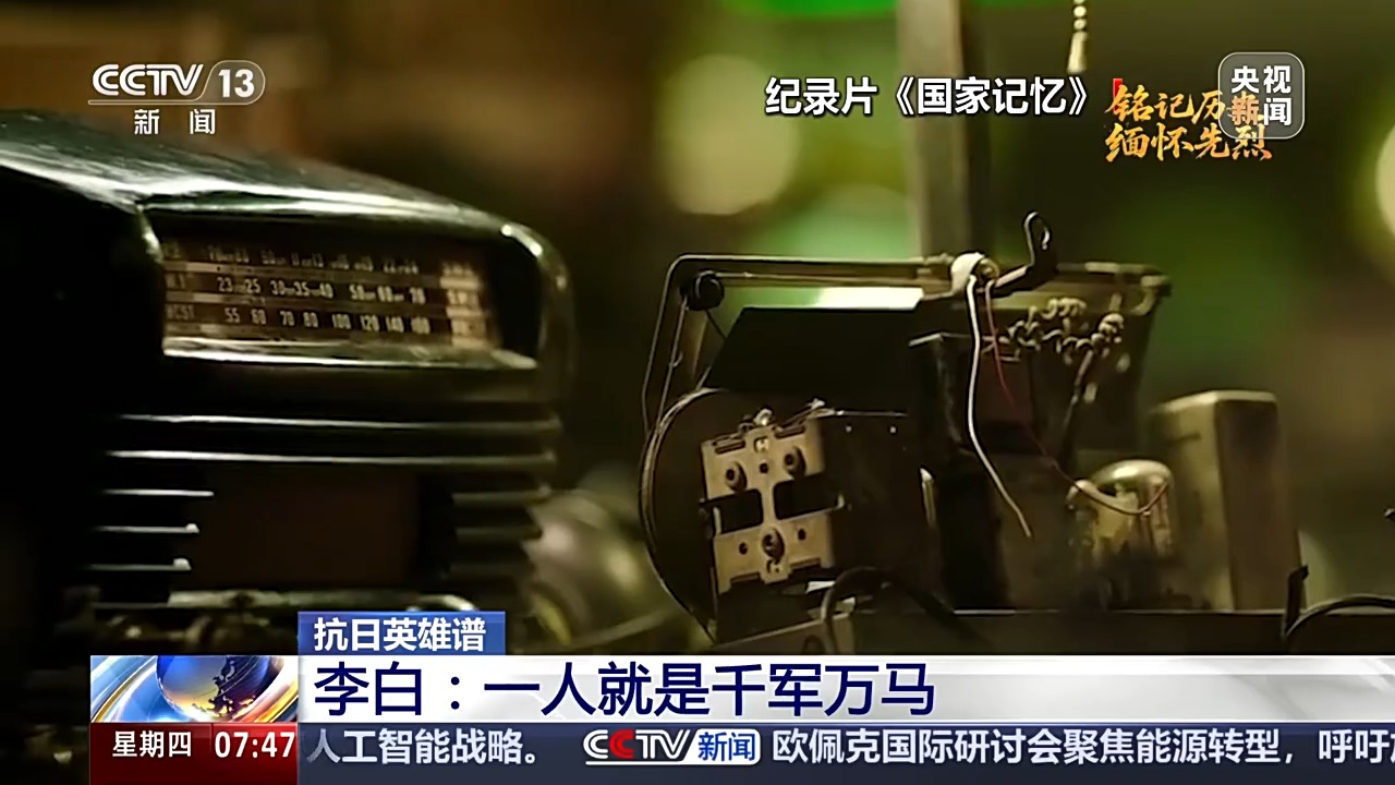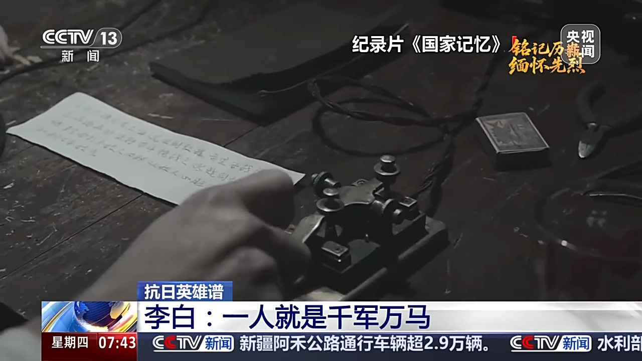 1942年9月的一天,李白拿到几份重要情报,立即上报延安。半夜,红色的电波划破黑夜的长空。发报即将结束时,突然传来警报声,李白沉着地把最后一段电文发完,迅速拆散发报机,拉开卧室一块活动地板,将它藏在下边。日本宪兵闯进房间,四处搜查。