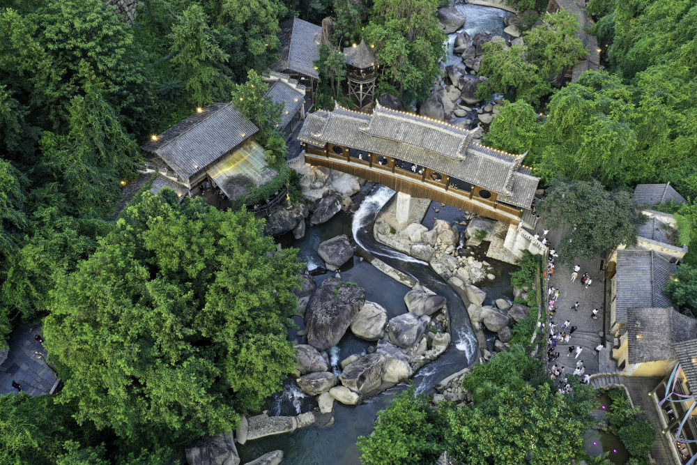 修复后的生态资源如何发挥经济效益?2010年,广信区引进九牛文旅集团,以峡谷漂流为旅游发展切入点,花费10多年时间一步步打造出一个集山水人文景观、民俗体验、活动演艺于一体的度假旅游区。九牛文旅集团副总裁熊慧介绍,为了“给游客一个来的理由”,公司在110多米高的悬崖上凌空打造出“悬崖民宿”,客房的设计布局各不相同,房间地面不是传统的地板,而是透明的悬空玻璃,游客站在床边,低头就能看到飞泻的瀑布和流淌的溪水。