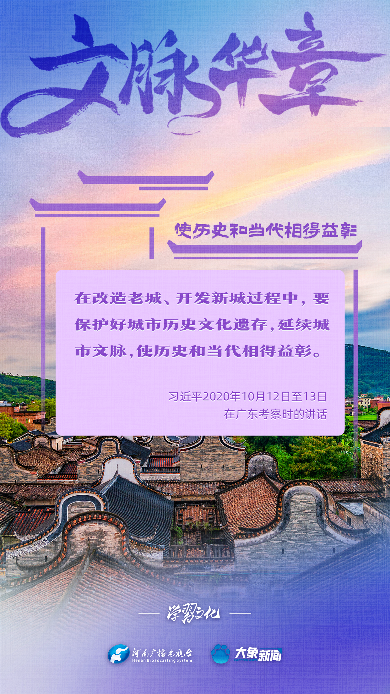 习近平总书记非常注重城市发展中的文脉赓续,多次强调“要结合区域文化、历史传承、时代要求,打造城市特色风貌”“使历史和当代相得益彰”等等,着力引导各地各部门完善历史文化保护传承体系,完善城市风貌管理制度,保护城市独特的历史文脉、人文地理、自然景观。大象新闻为您梳理,我们一起学习。