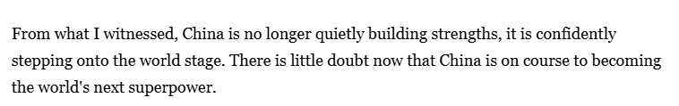 “中国已不再低调积蓄力量,而是自信地走进世界舞台中央。如今几乎无人怀疑,中国正稳步迈向全球下一个超级大国的行列。”