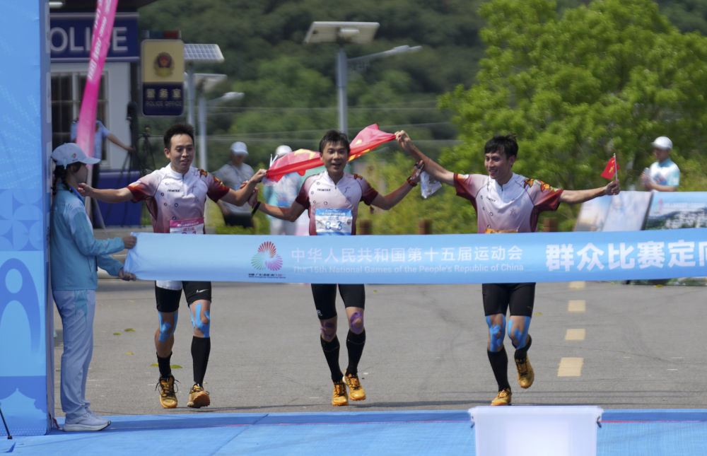 5月8日,广东队选手李卓业(中)、唐建达(左)、唐潇在男子定向接力赛中冲向终点。当日,第十五届全国运动会群众赛事活动定向接力赛决赛在广东省茂名市高州根子镇举行。新华社记者 黄国保 摄