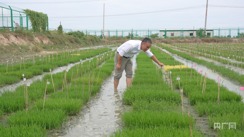 王仕明观察不同品种水稻的生长情况(央广网记者 索迪 摄)