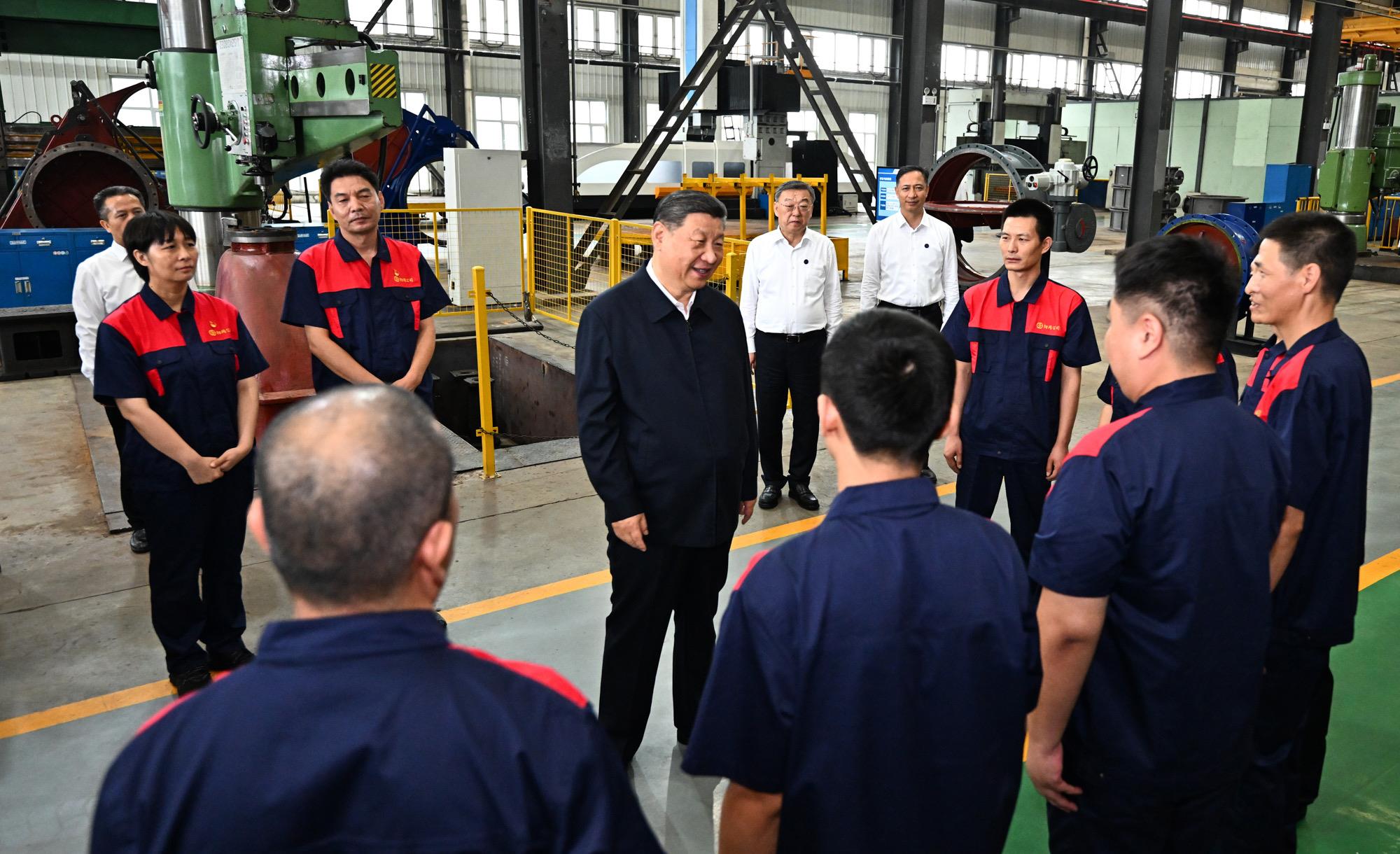 △2025年7月7日,习近平总书记在山西阳泉阀门股份有限公司考察时,同企业员工亲切交流。