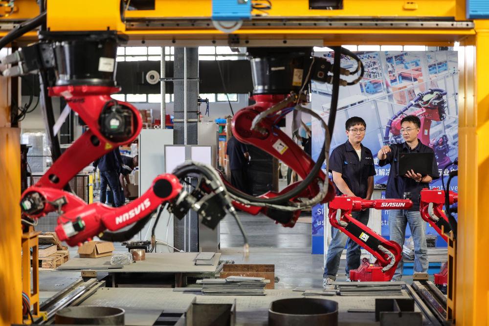 2024年6月3日,沈阳新松机器人自动化股份有限公司的机器人研发工程师讨论智能焊接机器人平台焊接方案。机器人工程技术人员作为人力资源和社会保障部2022年6月公布的18个新职业之一,在研发设计机器人工作中扮演着重要角色。让“铁疙瘩”听懂话、干对活,是他们的重要工作内容。