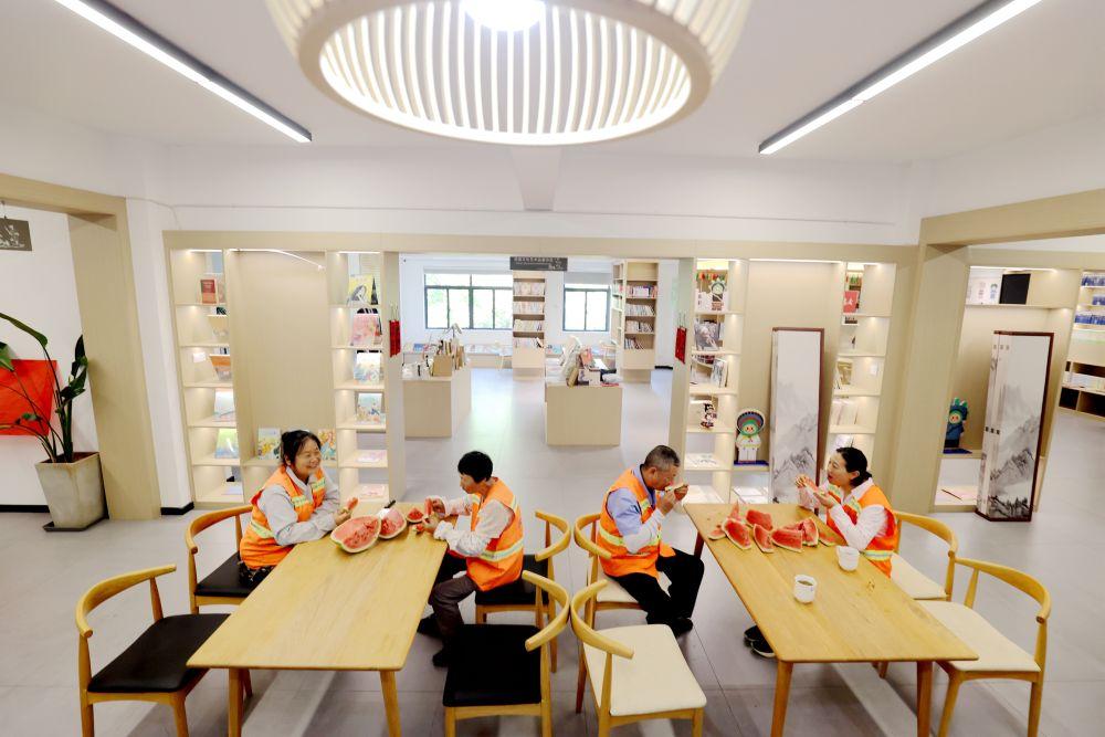 2024年8月6日,在浙江省湖州市阜溪街道兴山社区工会驿站,环卫工人在工作间隙休憩纳凉。