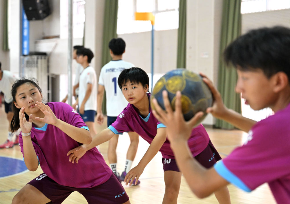 7月11日,郑州市第七十六中学荷球队球员在练习传接球。荷球是一项男女混合球类运动,也是本届世界运动会比赛项目。新华社记者 李嘉南 摄
