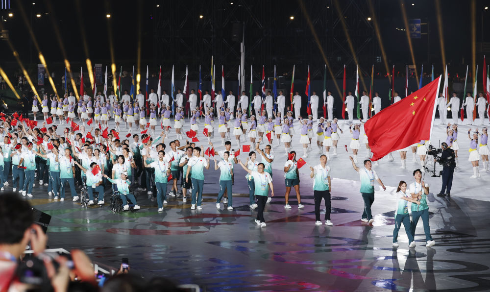 ↑中国体育代表团在开幕式上入场。新华社记者 陈振海 摄