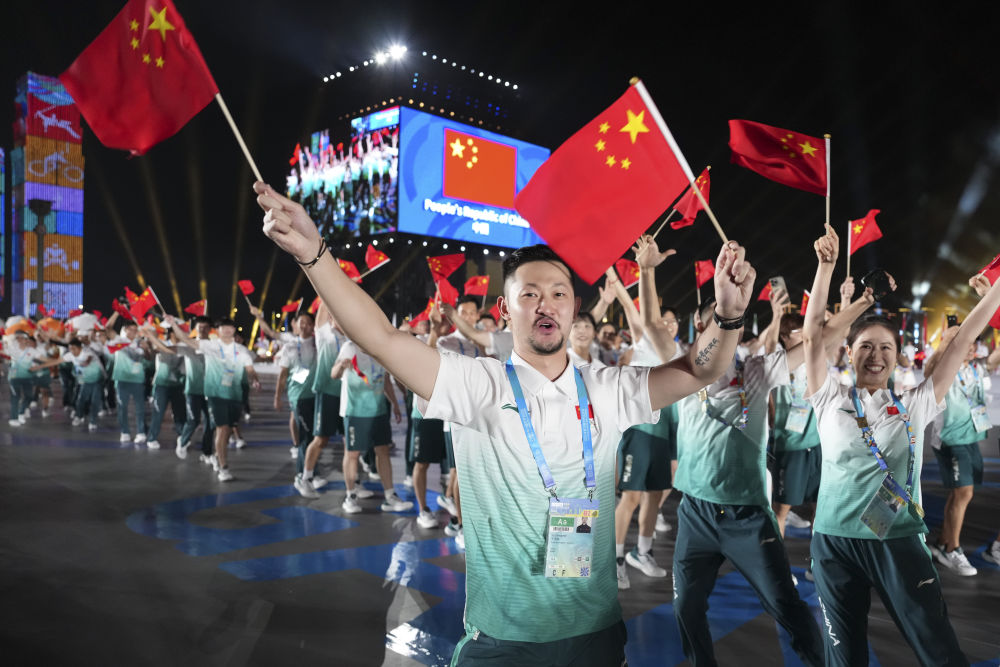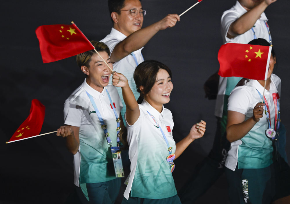 ↑中国体育代表团旗手郭丹(左)和史经纬在开幕式上入场。新华社记者 杜子璇 摄